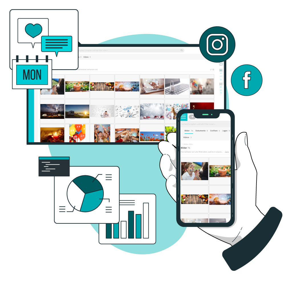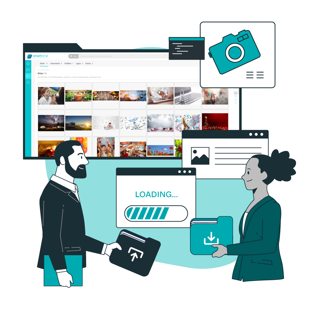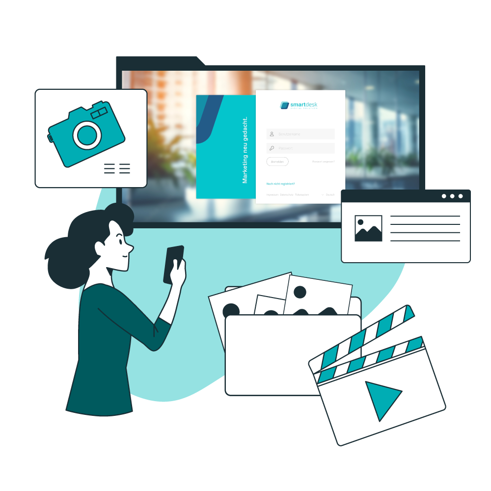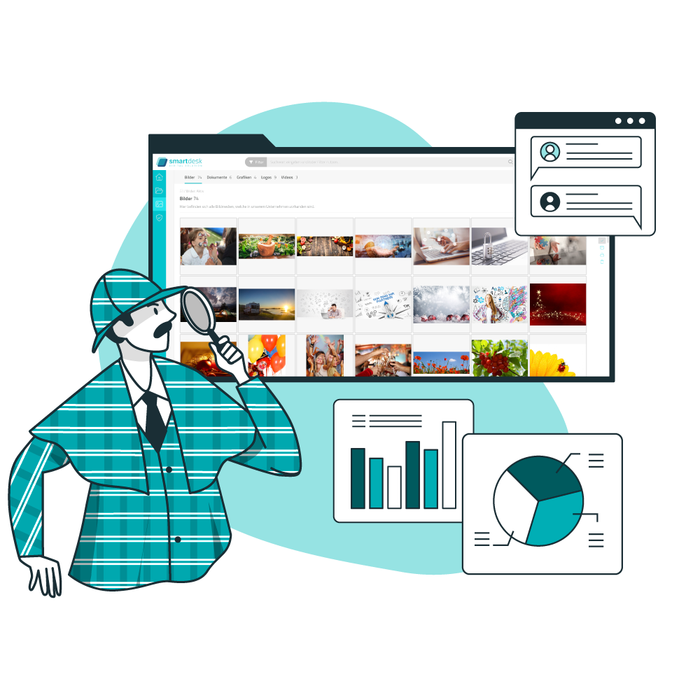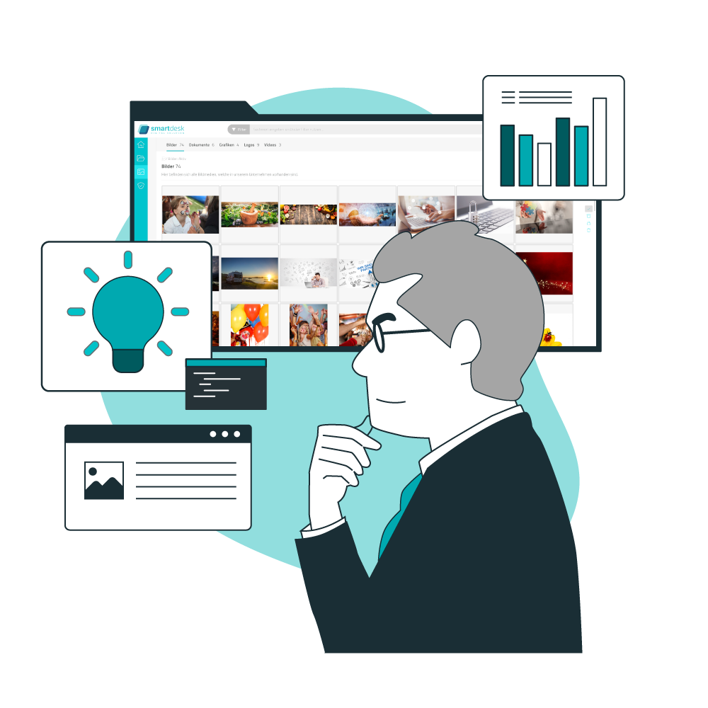 Die Medienverwaltung der smartdesk bietet einen perfekten Überblick über Ihre gesamten Dokumente. Lassen Sie das Digital Asset Management (DAM) flexibel nach Dateien suchen. Geben Sie selbst gewählte Suchkriterien wie Kategorien, Stichwörter oder individuelle Merkmale ein. Sie werden mit unserer innovativen Digital Asset Management Software jedes Mal einen Treffer landen.